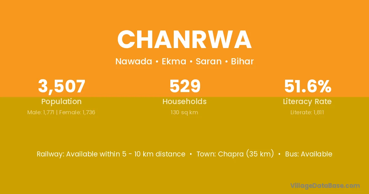Chapra (35 km) is the nearest town to Chanrwa village for major economic activities and is located approximately 35 km away.