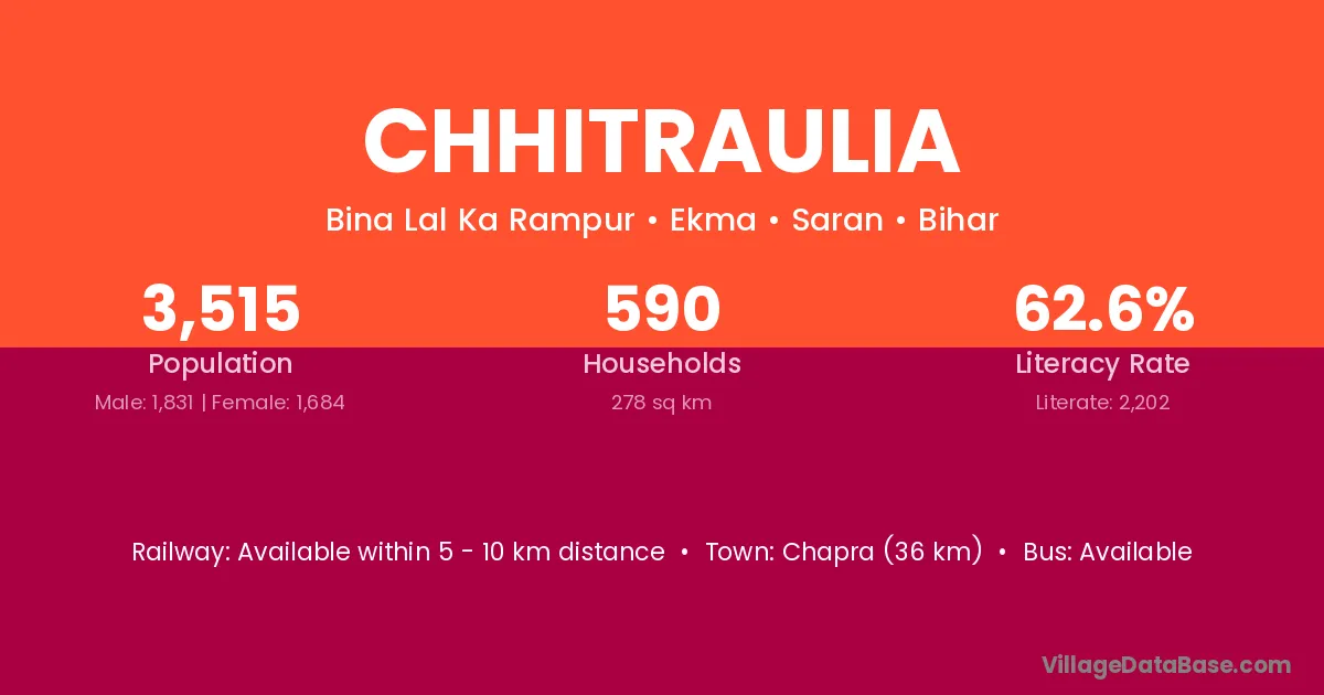 Chapra (36 km) is the nearest town to Chhitraulia village for major economic activities and is located approximately 36 km away.
