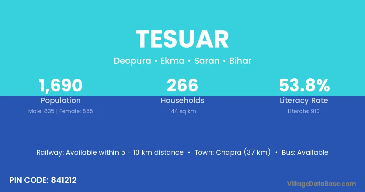 Chapra (37 km) is the nearest town to Tesuar village for major economic activities and is located approximately 37 km away.