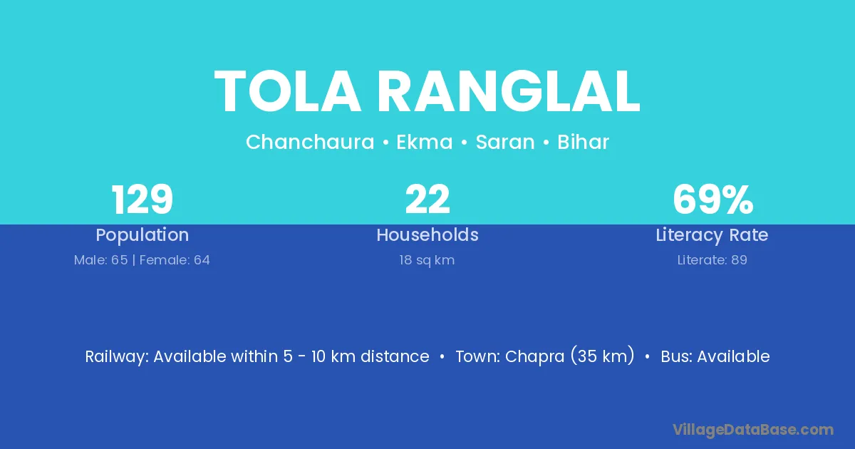 Chapra (35 km) is the nearest town to Tola Ranglal village for major economic activities and is located approximately 35 km away.