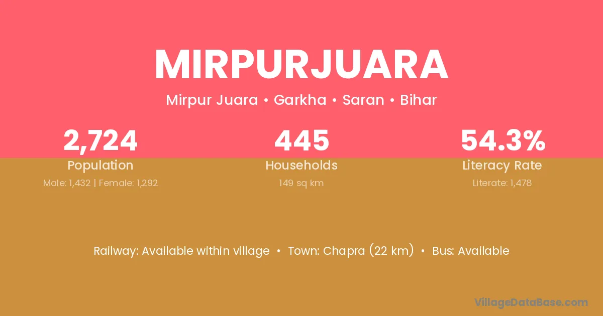 Chapra (22 km) is the nearest town to Mirpurjuara village for major economic activities and is located approximately 22 km away.