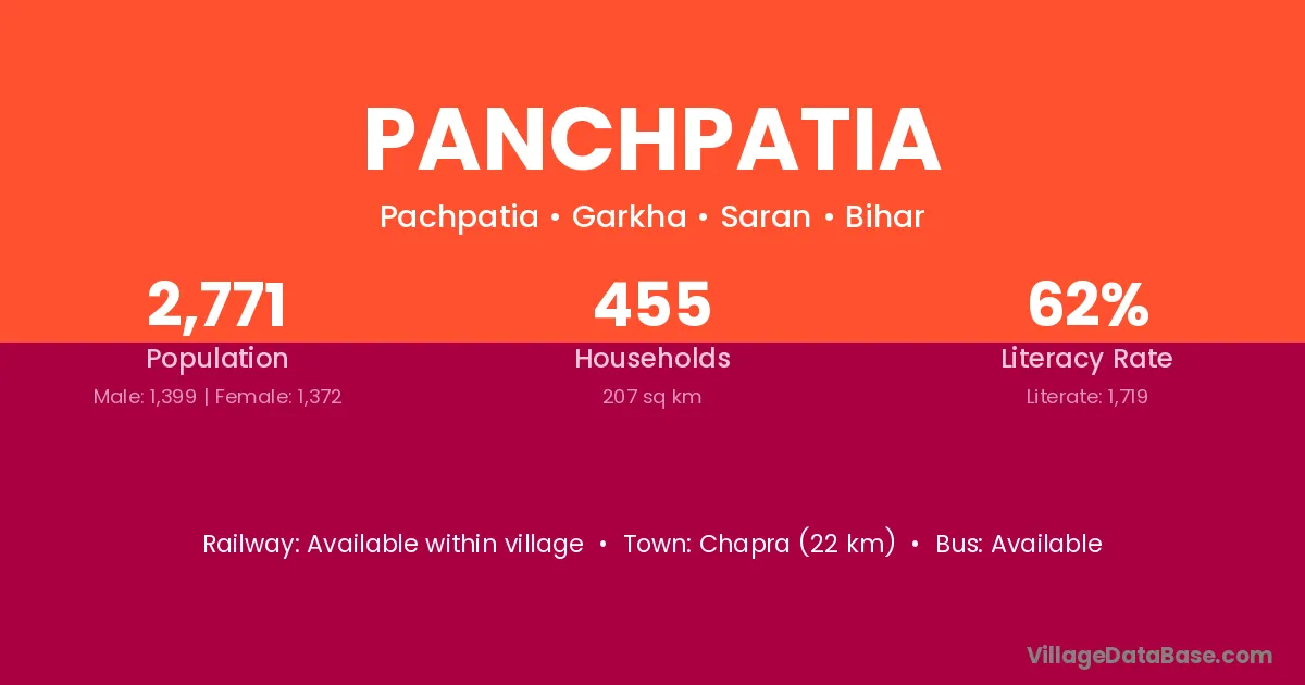 Chapra (22 km) is the nearest town to Panchpatia village for major economic activities and is located approximately 22 km away.