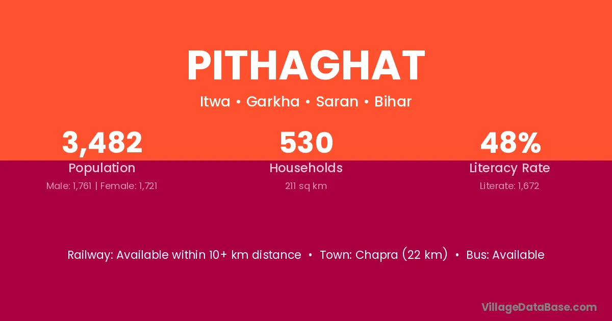 Chapra (22 km) is the nearest town to Pithaghat village for major economic activities and is located approximately 22 km away.