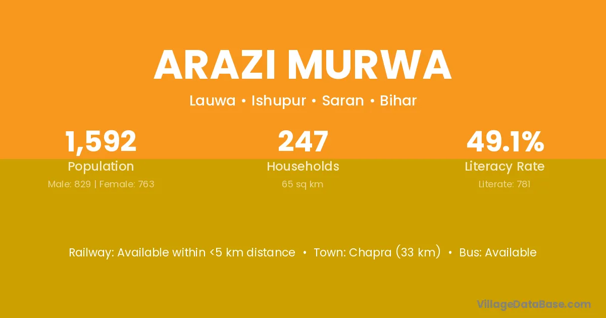 Chapra (33 km) is the nearest town to Arazi Murwa village for major economic activities and is located approximately 33 km away.