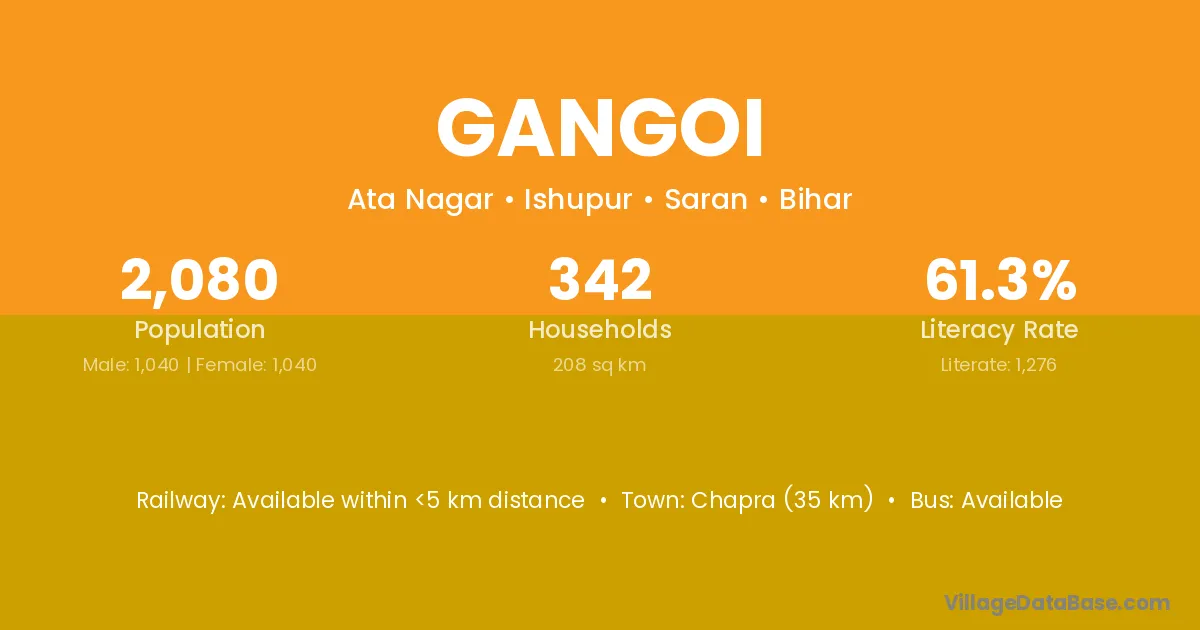 Chapra (35 km) is the nearest town to Gangoi village for major economic activities and is located approximately 35 km away.