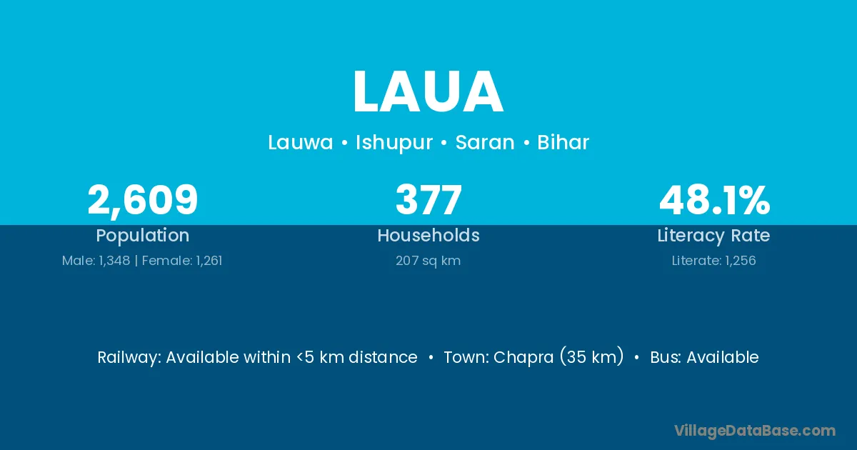 Chapra (35 km) is the nearest town to Laua village for major economic activities and is located approximately 35 km away.