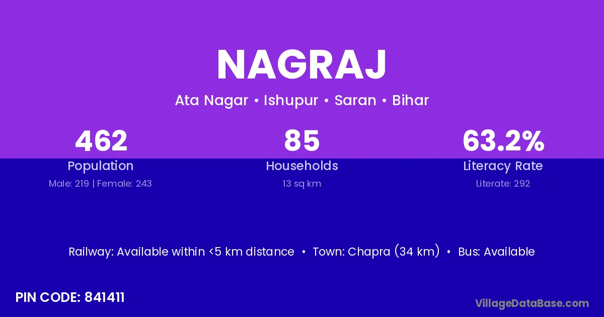 Chapra (34 km) is the nearest town to Nagraj village for major economic activities and is located approximately 34 km away.