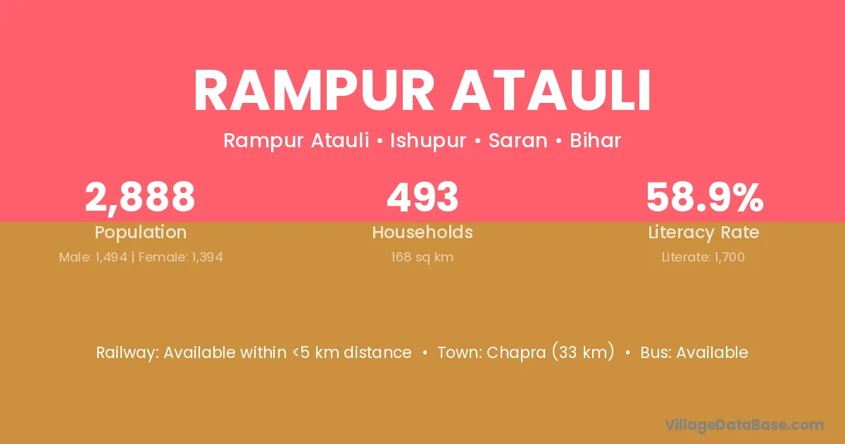 Chapra (33 km) is the nearest town to Rampur Atauli village for major economic activities and is located approximately 33 km away.