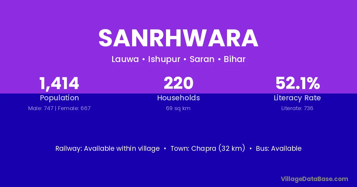 Chapra (32 km) is the nearest town to Sanrhwara village for major economic activities and is located approximately 32 km away.