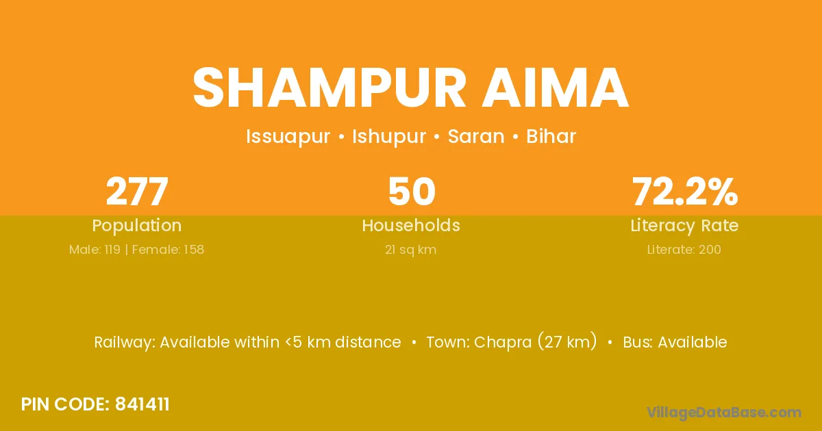 Chapra (27 km) is the nearest town to Shampur Aima village for major economic activities and is located approximately 27 km away.