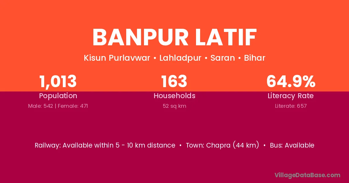 Chapra (44 km) is the nearest town to Banpur Latif village for major economic activities and is located approximately 44 km away.