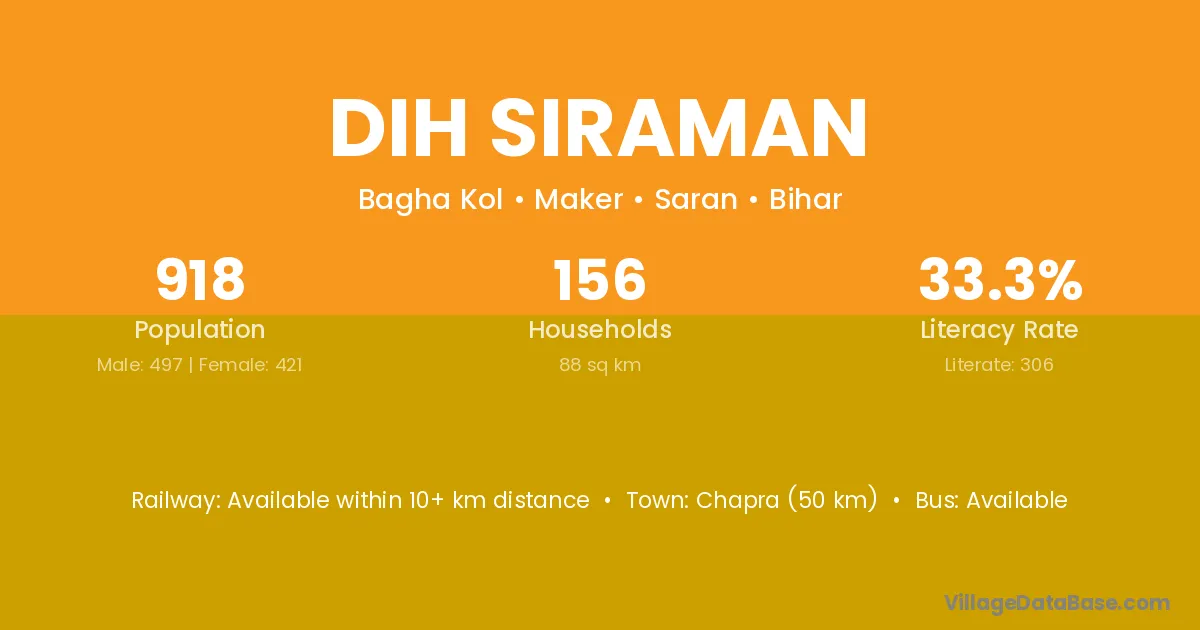Chapra (50 km) is the nearest town to Dih Siraman village for major economic activities and is located approximately 50 km away.