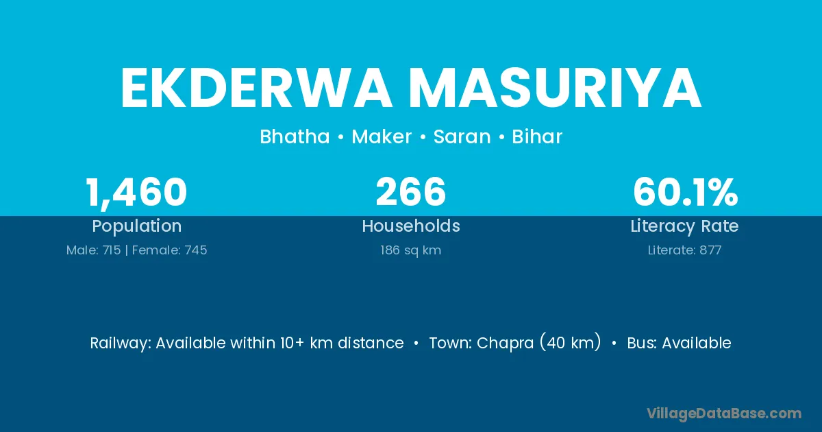 Chapra (40 km) is the nearest town to Ekderwa Masuriya village for major economic activities and is located approximately 40 km away.