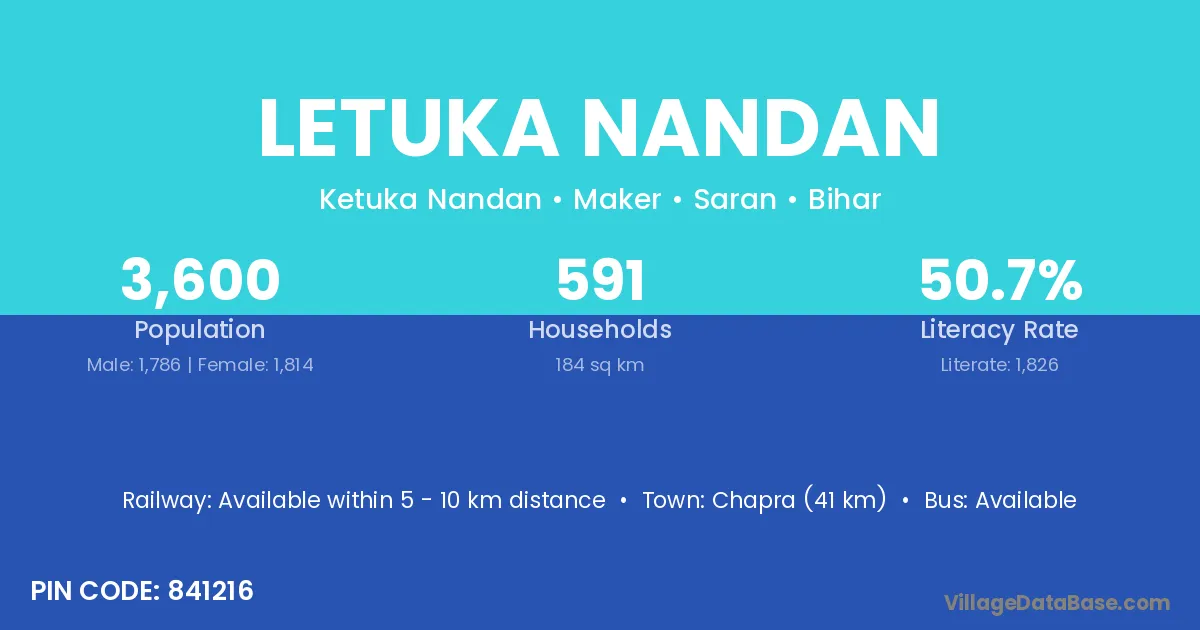 Chapra (41 km) is the nearest town to Letuka Nandan village for major economic activities and is located approximately 41 km away.