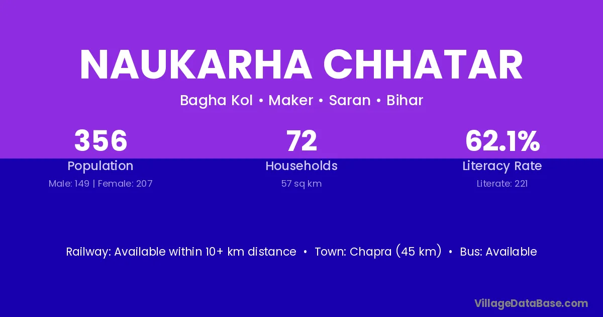 Chapra (45 km) is the nearest town to Naukarha Chhatar village for major economic activities and is located approximately 45 km away.
