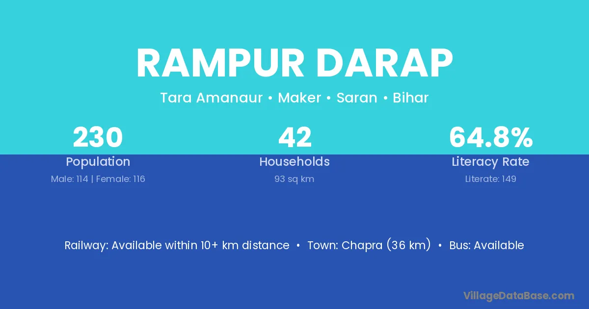 Chapra (36 km) is the nearest town to Rampur Darap village for major economic activities and is located approximately 36 km away.