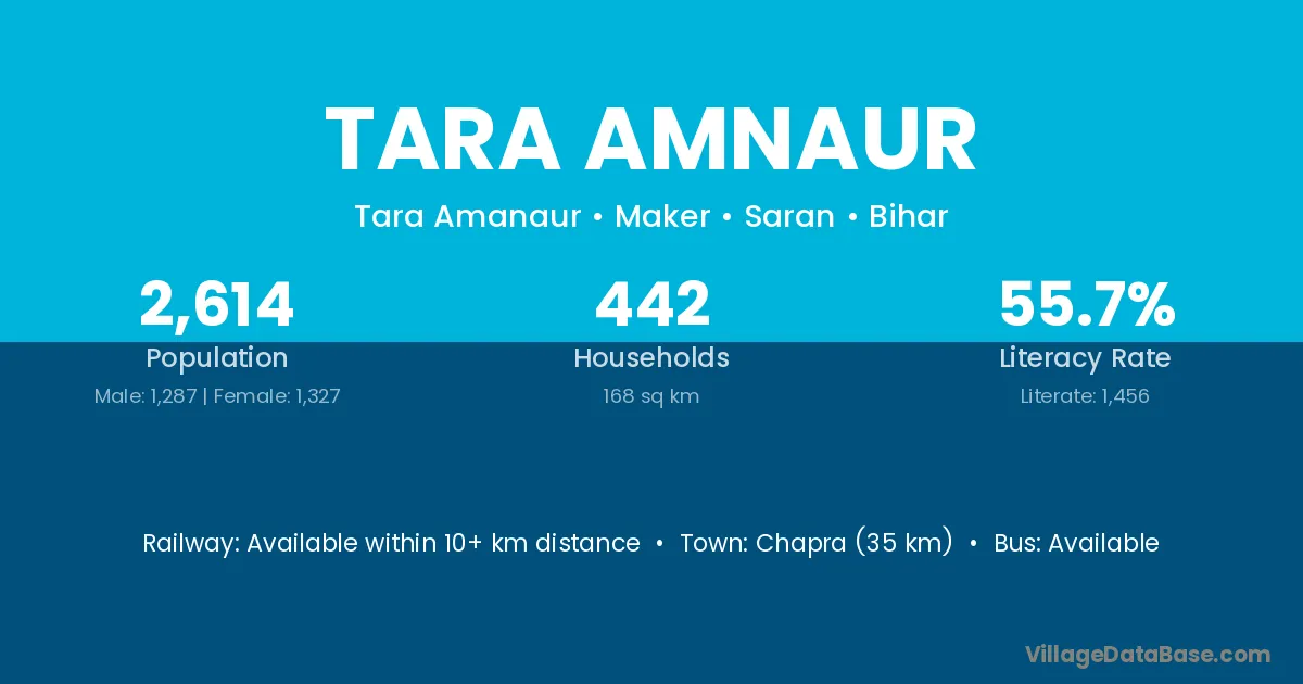 Chapra (35 km) is the nearest town to Tara Amnaur village for major economic activities and is located approximately 35 km away.