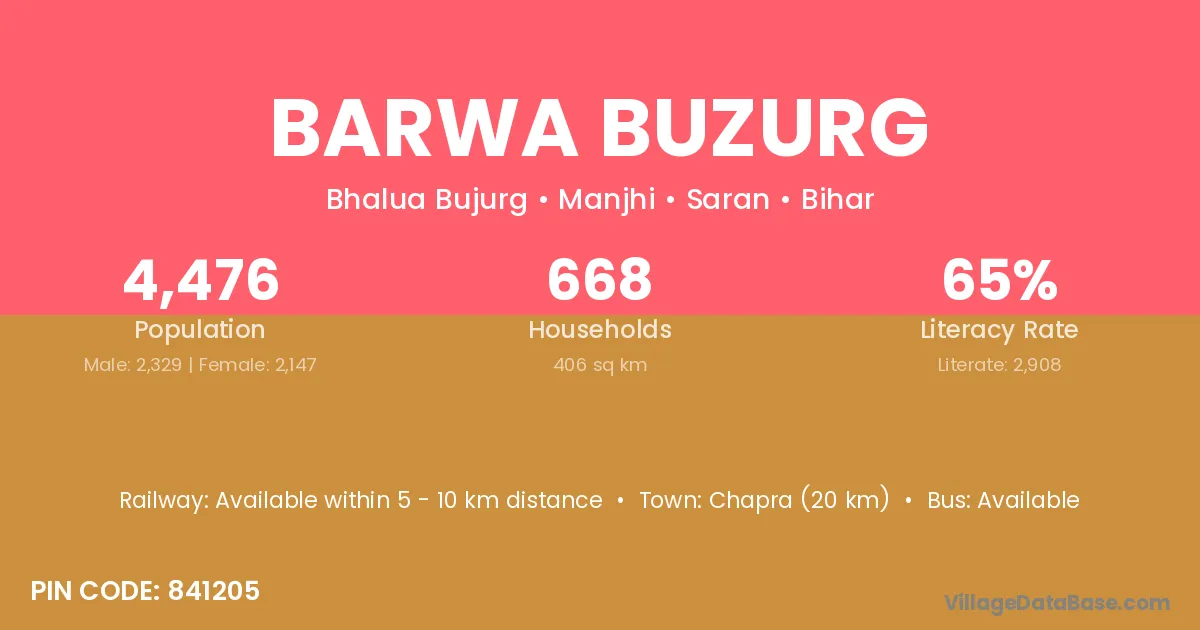 Chapra (20 km) is the nearest town to Barwa Buzurg village for major economic activities and is located approximately 20 km away.