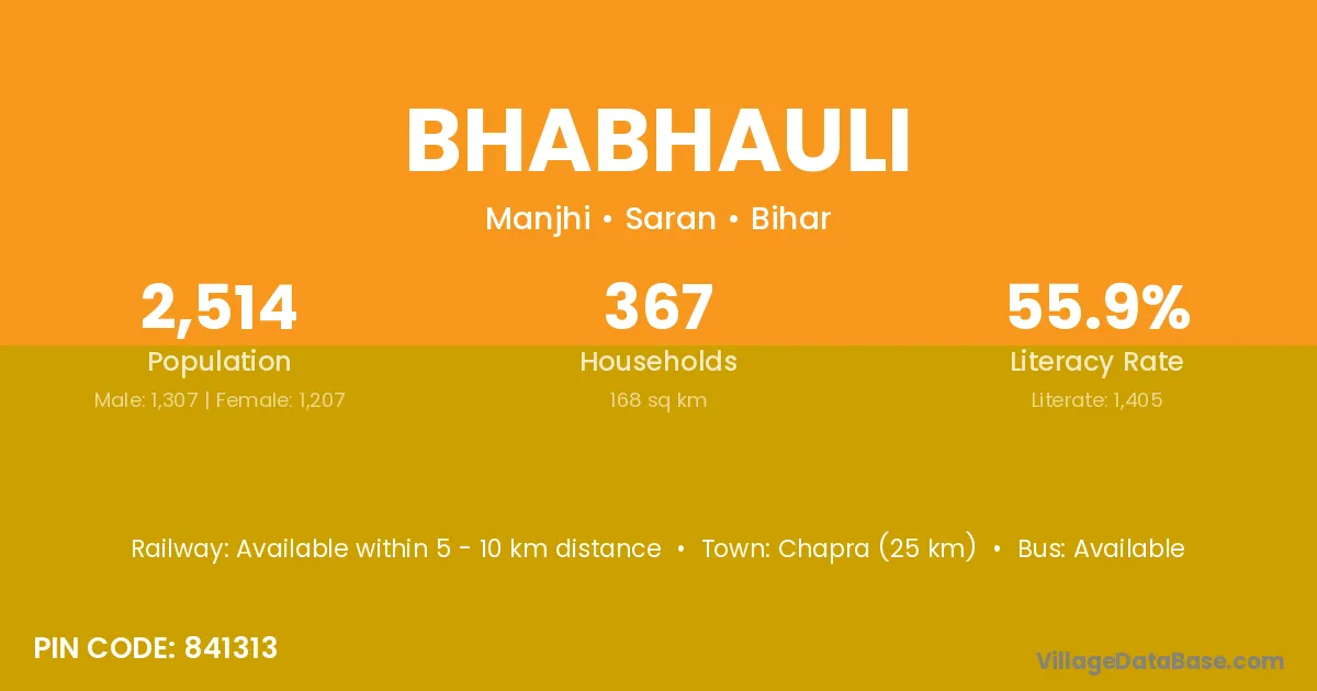 Chapra (25 km) is the nearest town to Bhabhauli village for major economic activities and is located approximately 25 km away.
