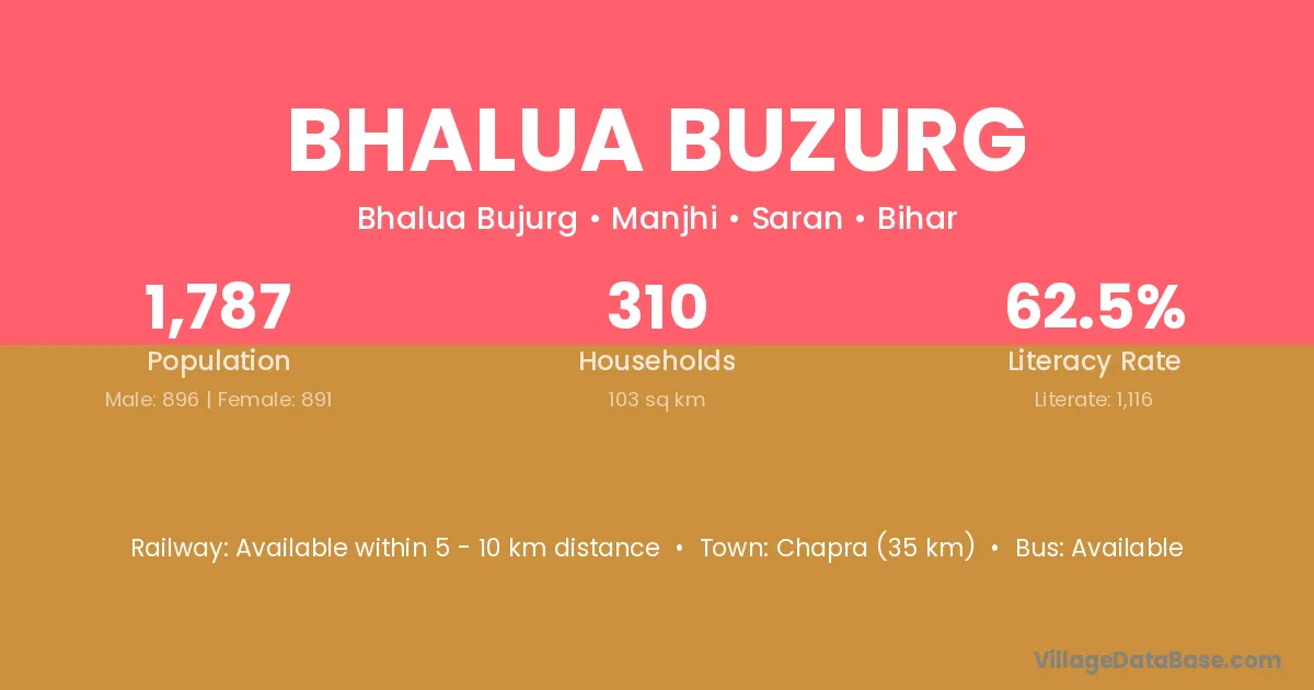 Chapra (35 km) is the nearest town to Bhalua Buzurg village for major economic activities and is located approximately 35 km away.