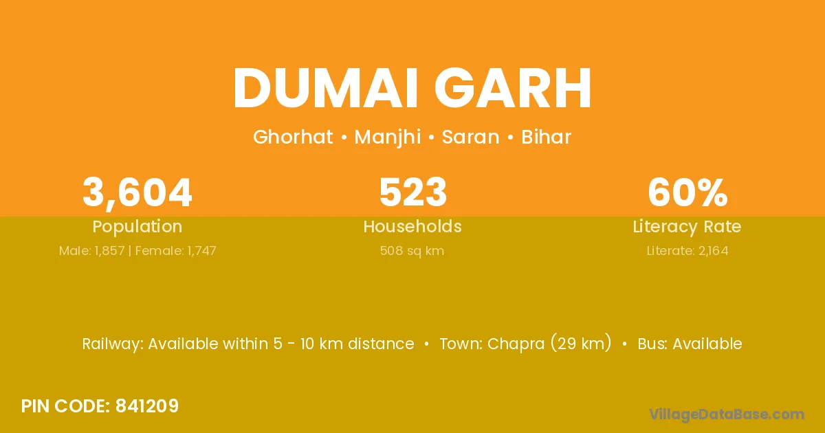 Chapra (29 km) is the nearest town to Dumai Garh village for major economic activities and is located approximately 29 km away.