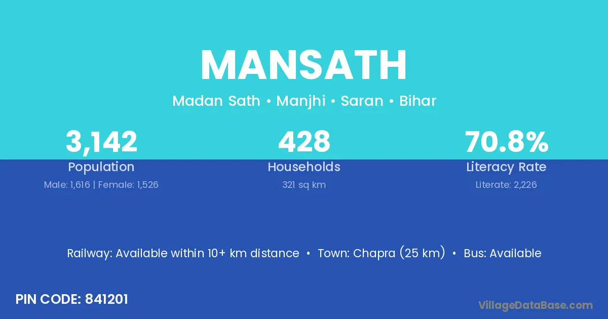 Chapra (25 km) is the nearest town to Mansath village for major economic activities and is located approximately 25 km away.