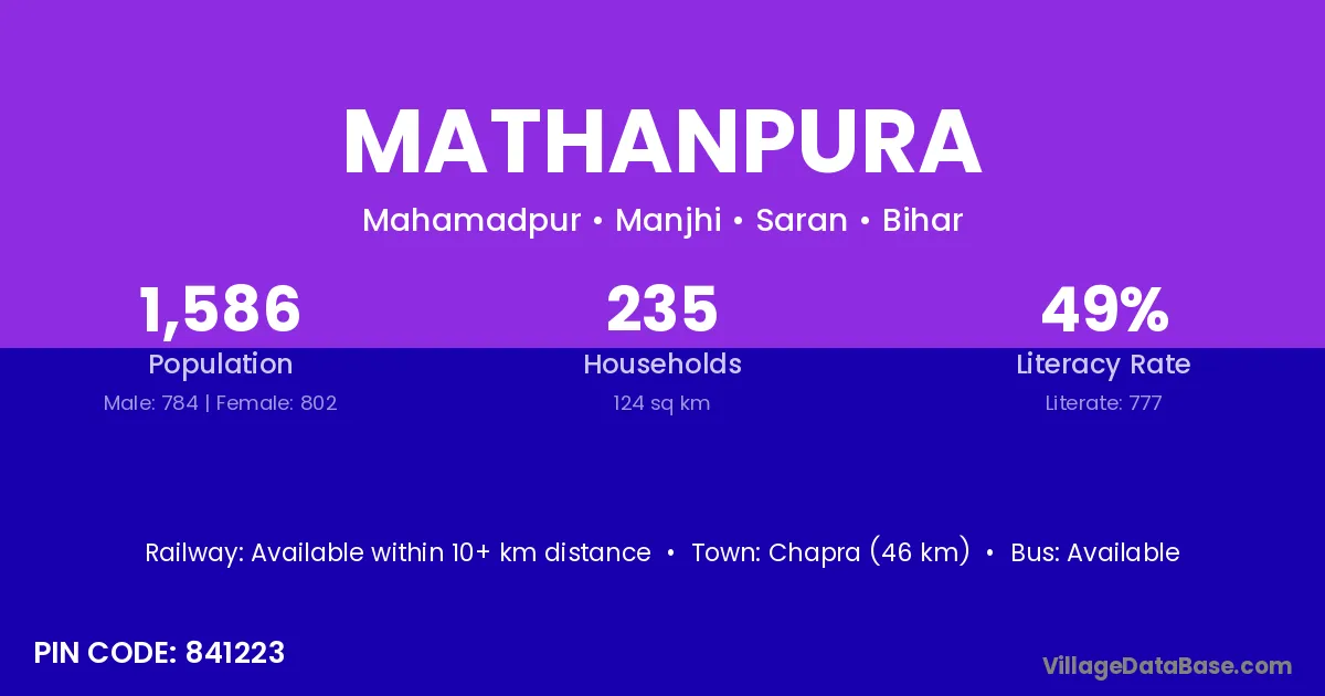 Chapra (46 km) is the nearest town to Mathanpura village for major economic activities and is located approximately 46 km away.
