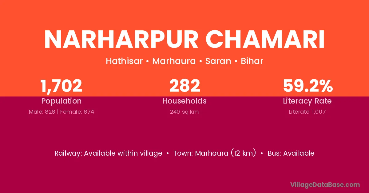 Marhaura (12 km) is the nearest town to Narharpur Chamari village for major economic activities and is located approximately 12 km away.