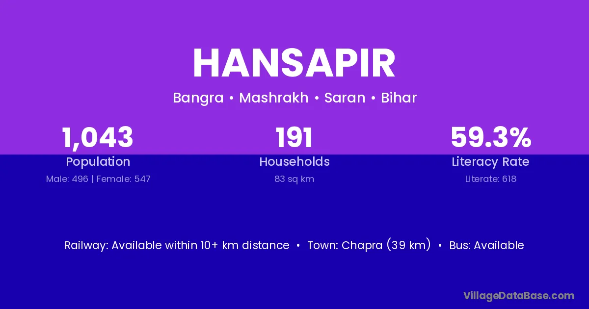 Hansapir village has a total population of 1,043 people, of which 496 are males and 547 are females.