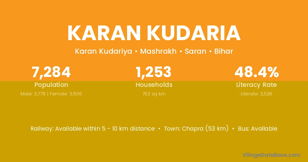 Chapra (53 km) is the nearest town to Karan Kudaria village for major economic activities and is located approximately 53 km away.