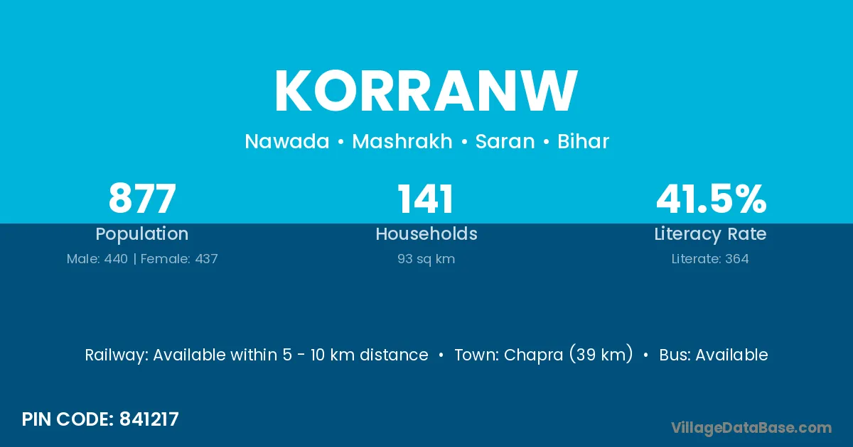 Chapra (39 km) is the nearest town to Korranw village for major economic activities and is located approximately 39 km away.