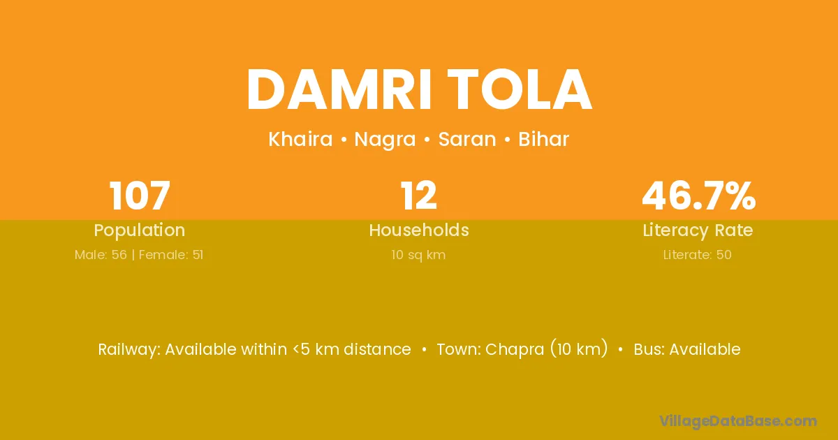 Chapra (10 km) is the nearest town to Damri Tola village for major economic activities and is located approximately 10 km away.