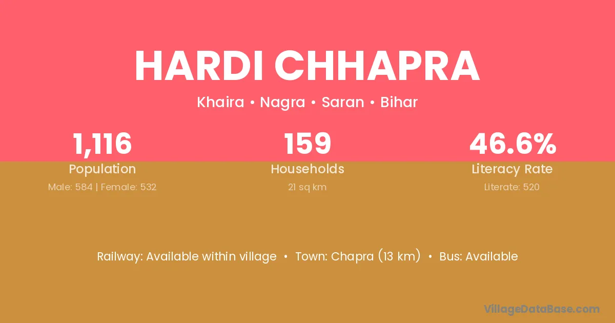 Hardi Chhapra village has a total population of 1,116 people, of which 584 are males and 532 are females.