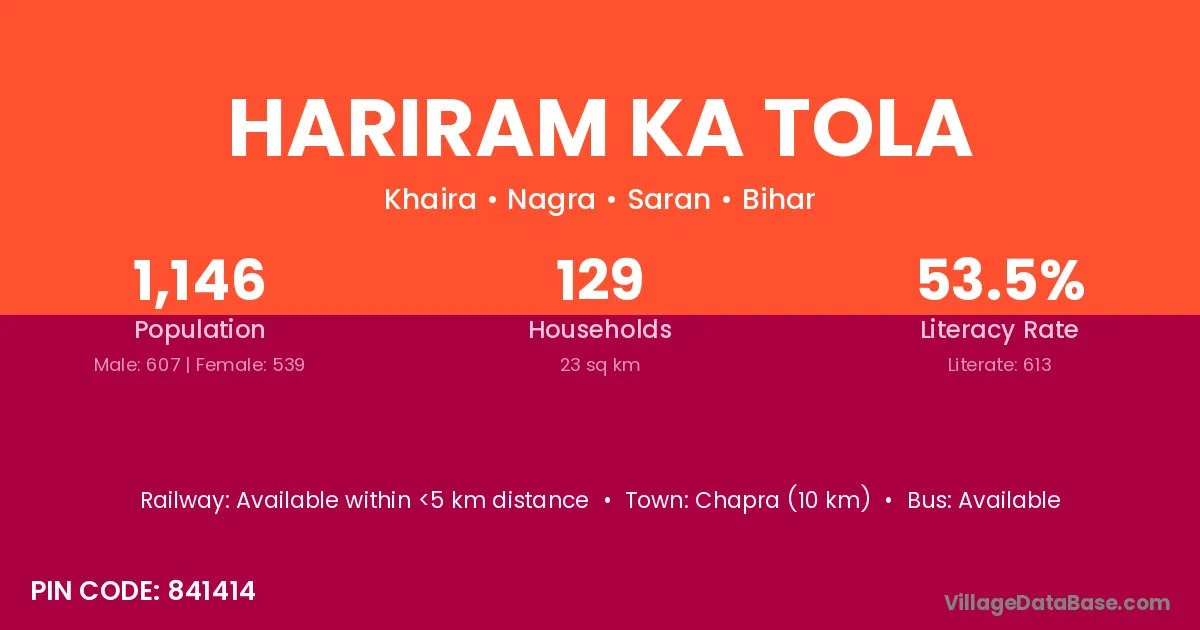 Hariram Ka Tola village has a total population of 1,146 people, of which 607 are males and 539 are females.