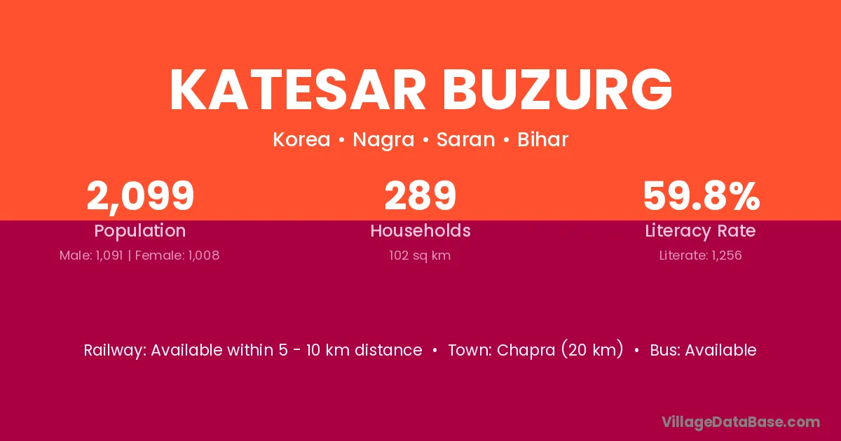 Chapra (20 km) is the nearest town to Katesar Buzurg village for major economic activities and is located approximately 20 km away.