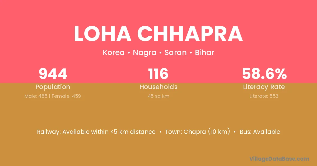 Chapra (10 km) is the nearest town to Loha Chhapra village for major economic activities and is located approximately 10 km away.