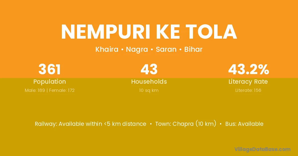 Chapra (10 km) is the nearest town to Nempuri Ke Tola village for major economic activities and is located approximately 10 km away.