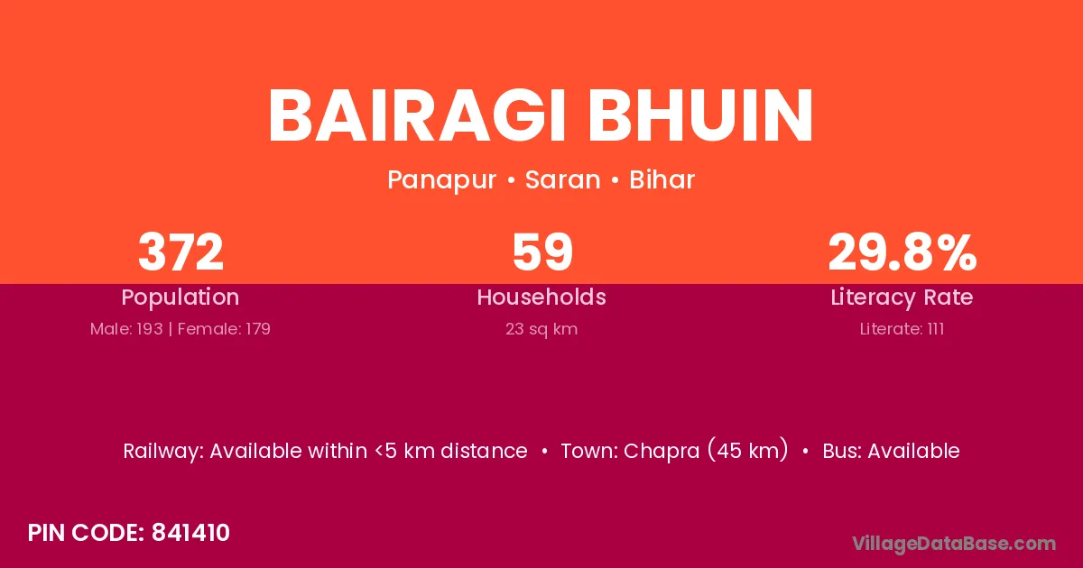 Chapra (45 km) is the nearest town to Bairagi Bhuin village for major economic activities and is located approximately 45 km away.
