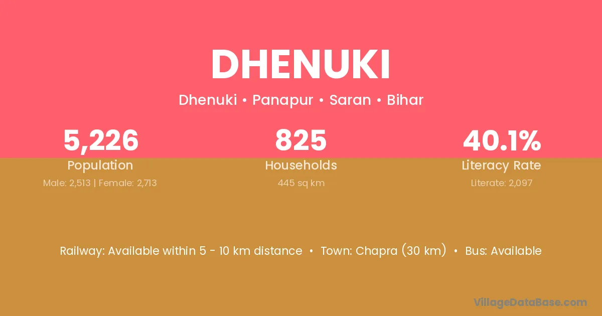 Chapra (30 km) is the nearest town to Dhenuki village for major economic activities and is located approximately 30 km away.