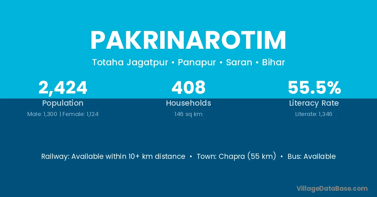 Chapra (55 km) is the nearest town to Pakrinarotim village for major economic activities and is located approximately 55 km away.