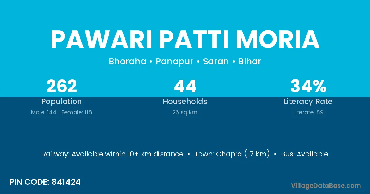 Chapra (17 km) is the nearest town to Pawari Patti Moria village for major economic activities and is located approximately 17 km away.