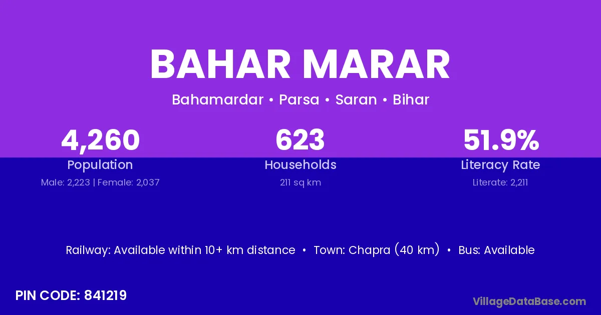 Chapra (40 km) is the nearest town to Bahar Marar village for major economic activities and is located approximately 40 km away.