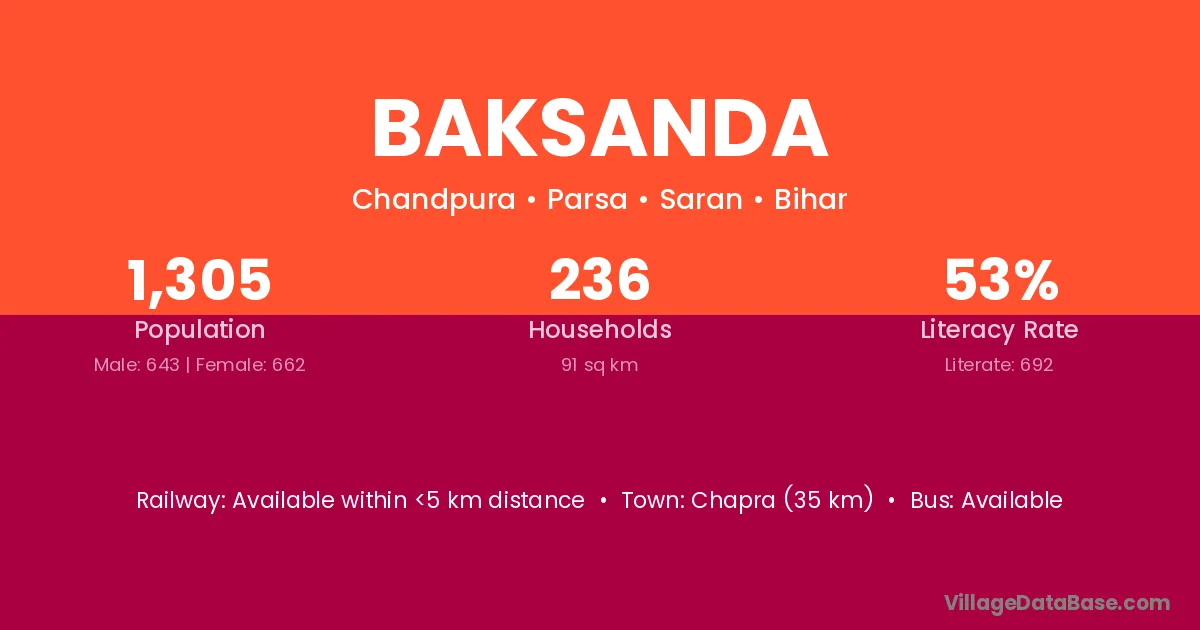 Chapra (35 km) is the nearest town to Baksanda village for major economic activities and is located approximately 35 km away.