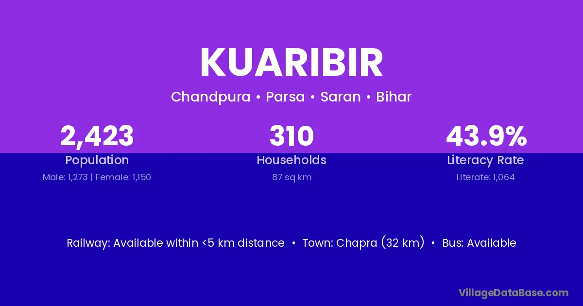 Chapra (32 km) is the nearest town to Kuaribir village for major economic activities and is located approximately 32 km away.