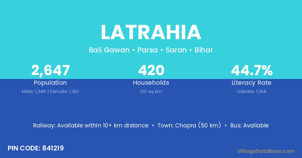 Chapra (50 km) is the nearest town to Latrahia village for major economic activities and is located approximately 50 km away.