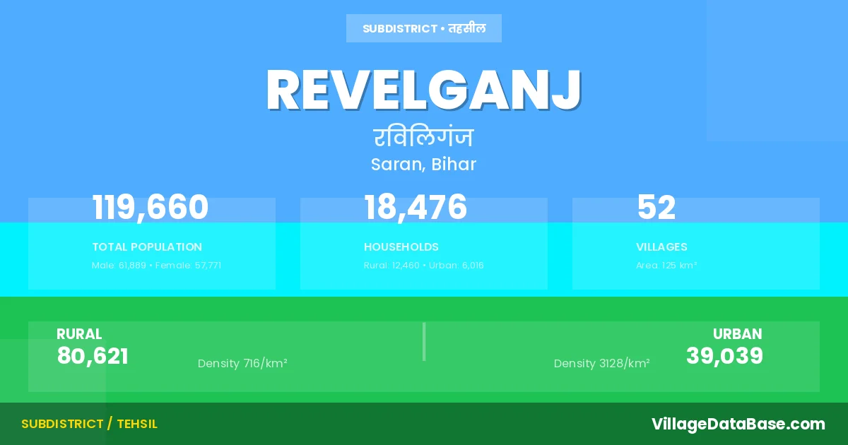 According to the 2011 census The total area of Revelganj Subdivision is 125 km², with a population of 119660 people. The population density is 956 inhabitants per square kilometre, and there are approximately 18476 houses in the sub district.