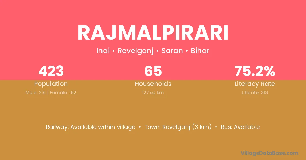 Rajmalpirari village has a total population of 423 people, of which 231 are males and 192 are females.