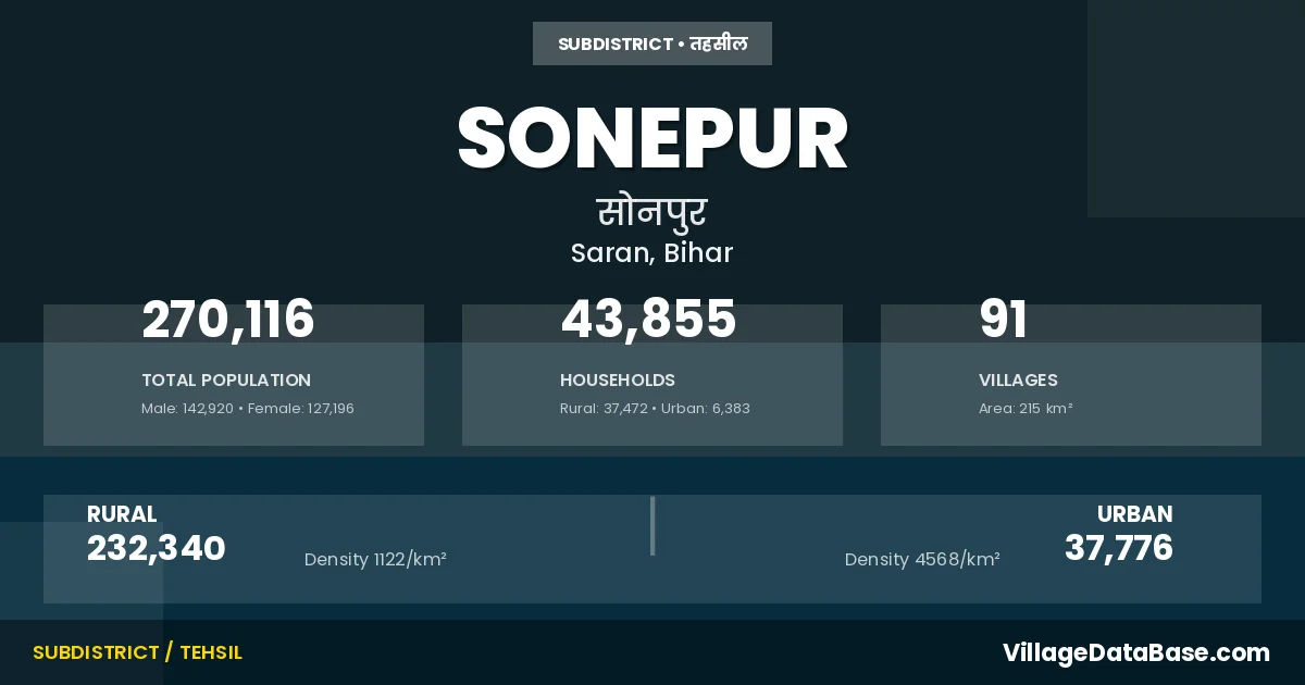 According to the 2011 census The total area of Sonepur Subdivision is 215 km², with a population of 270116 people. The population density is 1,254 inhabitants per square kilometre, and there are approximately 43855 houses in the sub district.