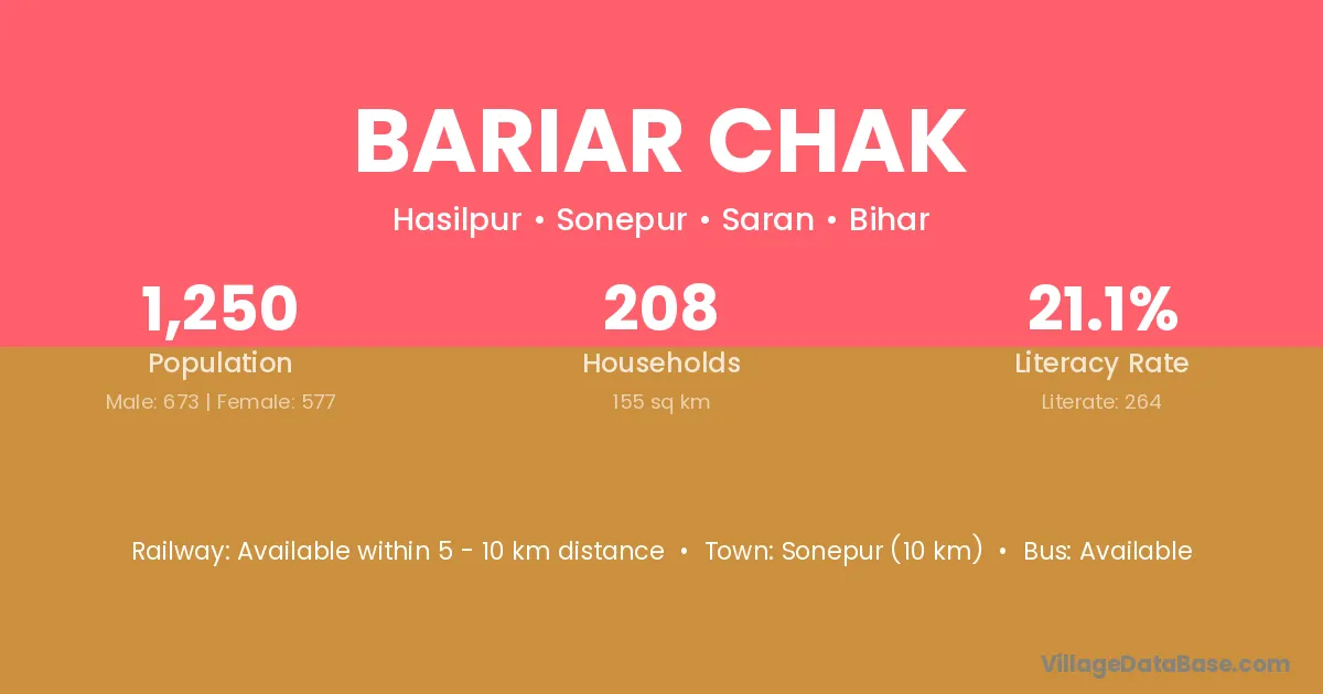 Bariar Chak village has a total population of 1,250 people, of which 673 are males and 577 are females.