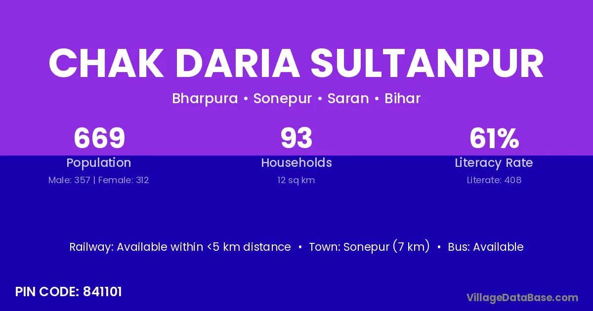 Chak Daria Sultanpur village has a total population of 669 people, of which 357 are males and 312 are females.